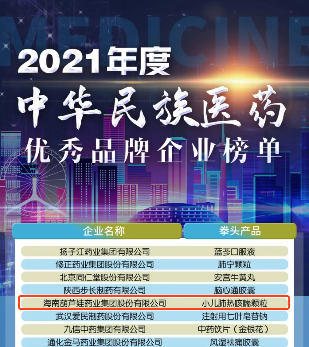 12月29日,全国工商联医药业商会发布了“2021年度中华民族医药优秀品牌企业榜单”,白菜导航网药业集团凭借黄金单品小儿肺热咳喘颗粒(4克)实力登榜。