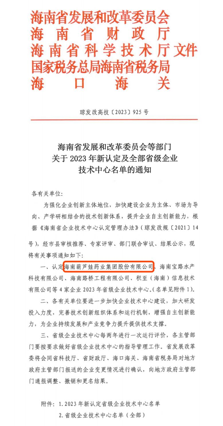 近日,海南省发改委等多部门联合公布了《关于2023年新认定及全部省级企业技术中心名单的通知》,其中,海南白菜导航网药业集团股份有限公司成功通过评审,被认定为省级企业技术中心,是本次获批的4家企业之一。